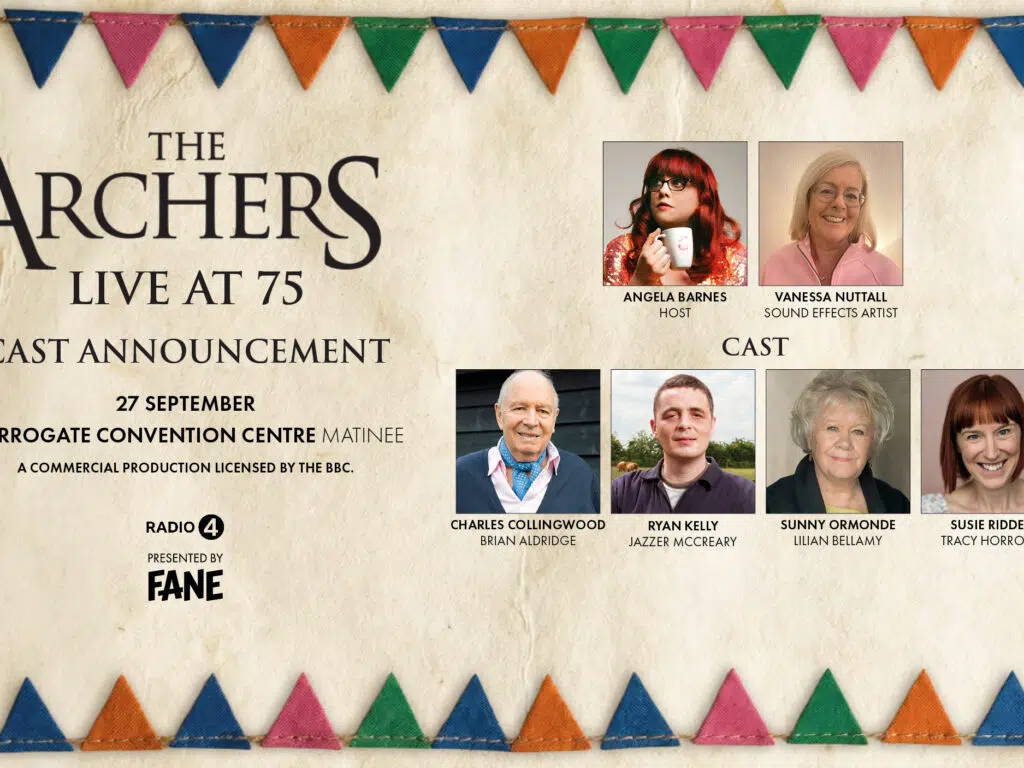 Joining us in Harrogate are four of Ambridge’s most beloved voices – Charles Collingwood (Brian Aldridge), Ryan Kelly (Jazzer McCreary), Susie Riddell (Tracy Horrobin) and Sunny Ormonde (Lilian Bellamy). Hosted by award-winning comedian and Archers devotee Angela Barnes, the performance will feature the cast of four actors and Vanessa Nuttall, The Archers’ live sound-effects specialist.